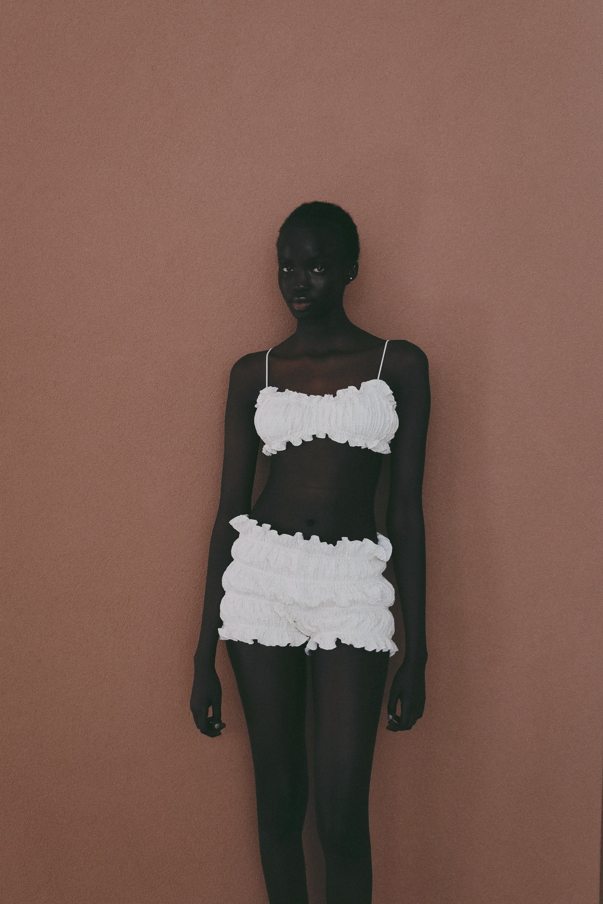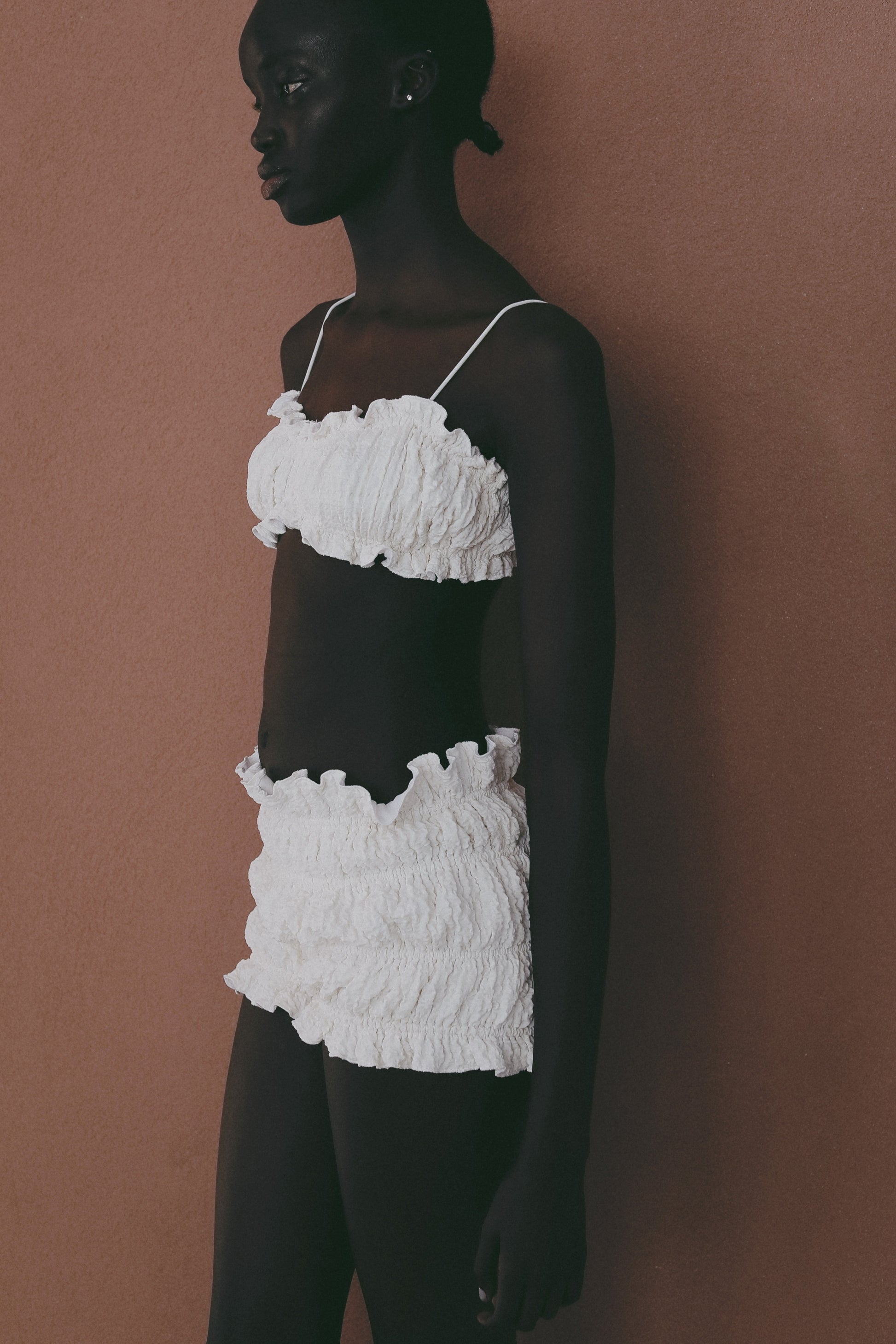 フリフリとした甘さのある素材を使用した、軽やかな印象の水着。
